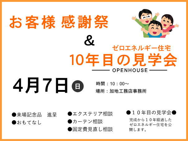 加地工務店新聞の10周年を記念して、感謝祭と、事務所裏の元モデルハウス(ゼロエネルギー住宅)の見学会をおこないます。