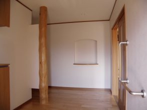 ご主人様ならではのこだわりで、玄関入って左側に天然ひのきの大黒柱をつけました。