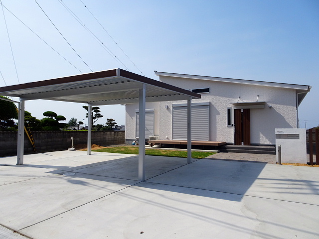 ガルバ二ウム屋根のスタイリッシュな平屋。玄関ドアはやまじ風に対応できるように引き戸にしました。