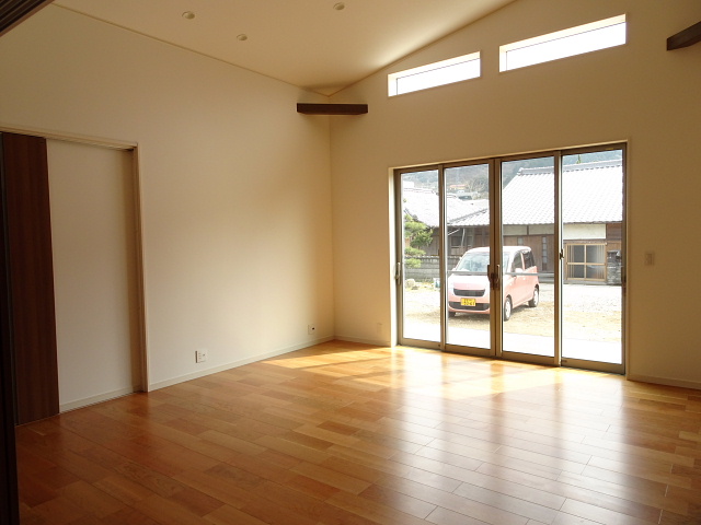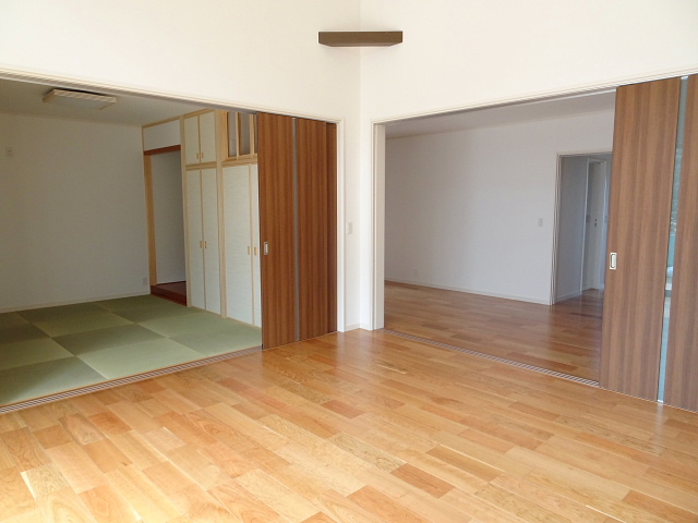 勾配天井のリビングに、DK、和室が隣接され、扉で仕切れる間取り。DKだけでも、和室だけでも、リビングだけでも使えます。