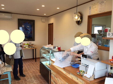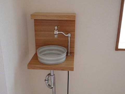 店内はレジ横のペンダントライトがポイント、洋菓子を並べるためのカウンターが充実しています。インテリア性も兼ねたコンパクトな手洗い器を設置しました。