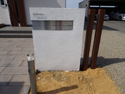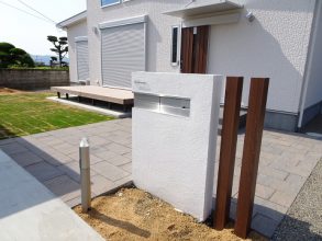 ポスト横にある枕木材と、玄関ドアの色は”クリエモカ”で合わせました。