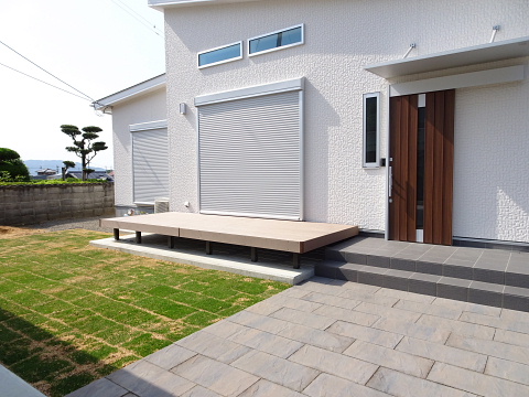 シンプルなエクステリアで、ウッドデッキや芝生がワンアクセントです。