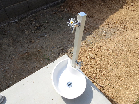 玄関に続くアプローチはタイルスタイル、水栓柱や枕木材は芝生の空間になじみやすいデザイン。