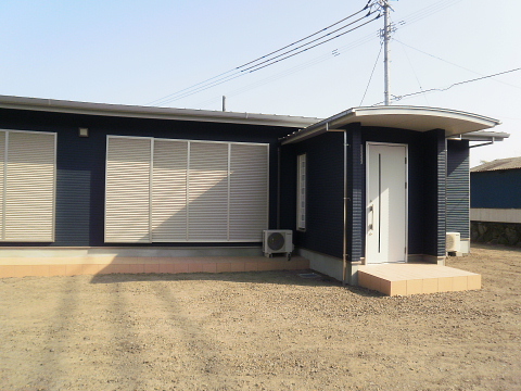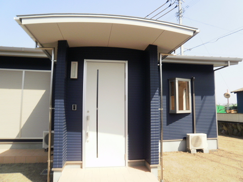 外観は、玄関が突き出た、Rの屋根。色は、紺色と白をバランスよくとりいれ、どこにもない、デザインです。
