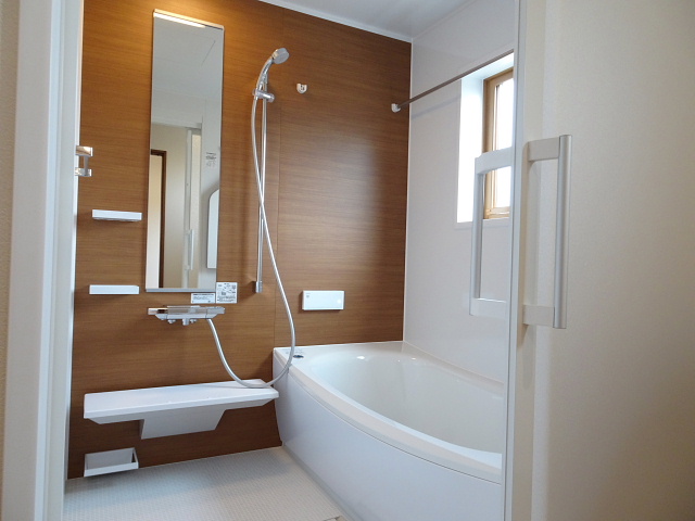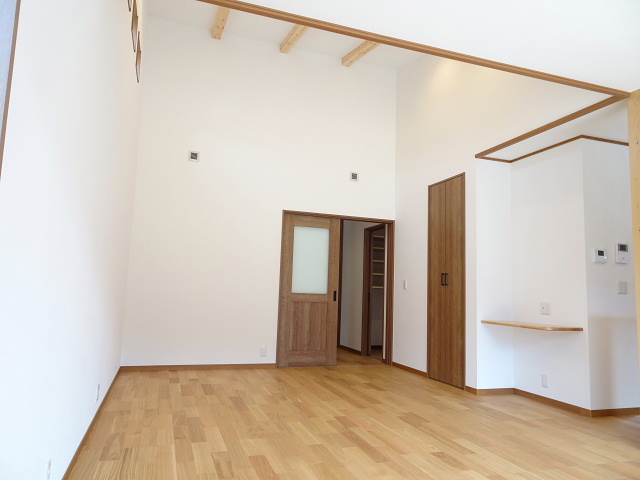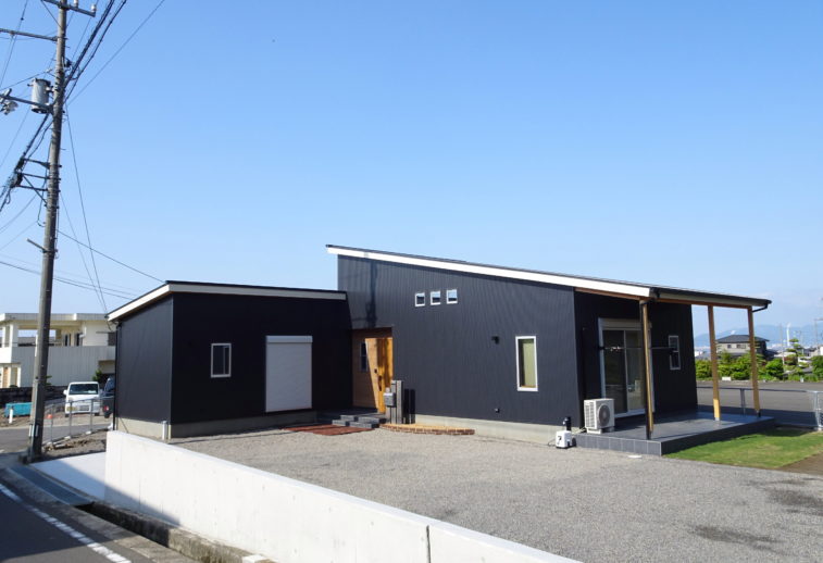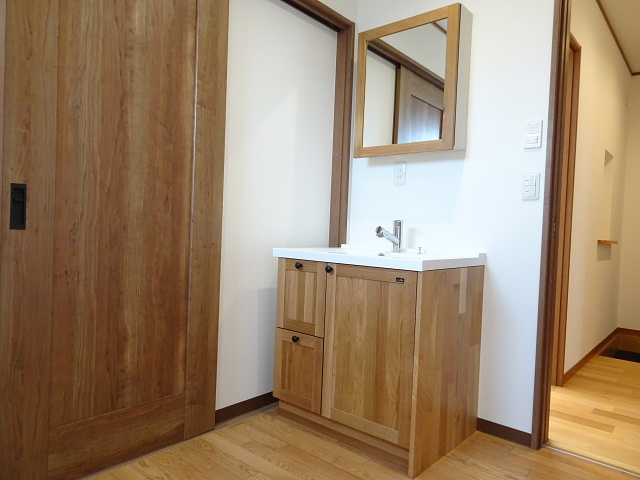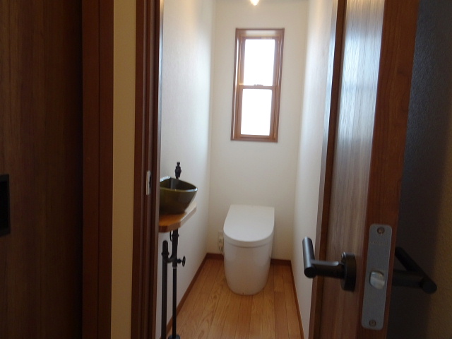 室内は梁の見えるリビング、無垢の木のキッチンや洗面化粧台、トイレやUBにも木目が使われて、木の温かみを感じる雰囲気です。また、ドアの取っ手はブラックのアイアン調で統一されお施主様のセンスの良さを感じます。