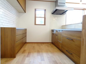 無垢の木のキッチン、取っ手はブラックのアイアン