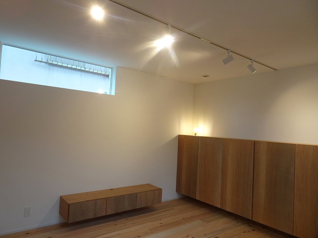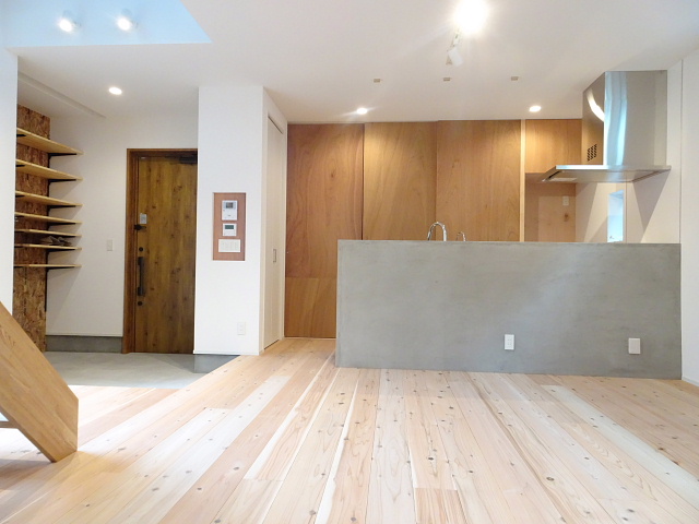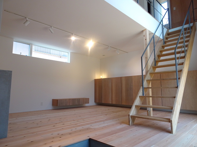 スポットライト、造作の収納や階段、アイアンの手すり、モルタル仕上げの腰壁など「ちょっとカッコイイ」仕様になっています。