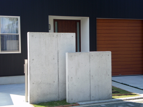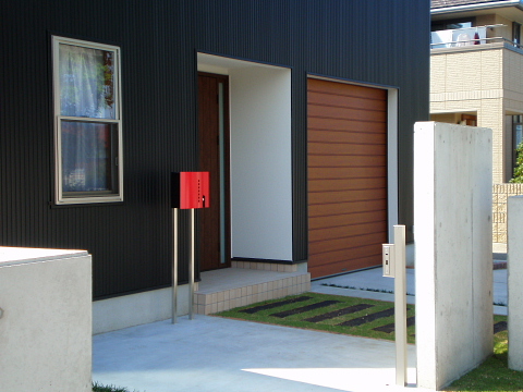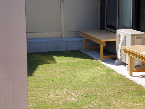 アプローチは、枕木と芝生で、素材を生かしました。