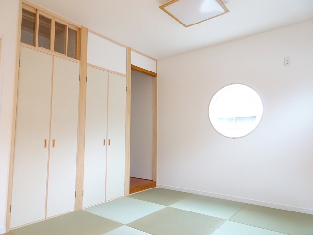 円窓のある和室や、TVボード部分はエコカラット、床はサクラの無垢材などこだわり空間で家族団欒を楽しみます。