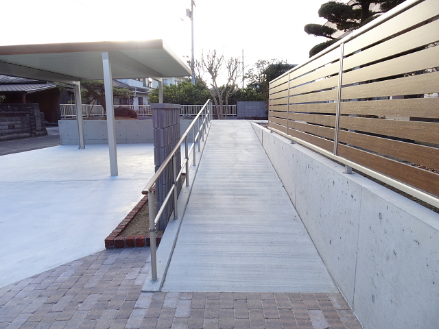 家と駐車場まで距離があるので、スロープを降りたところにベンチを設けました