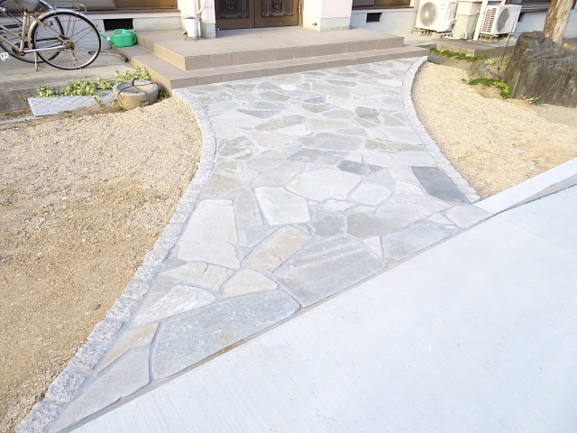 スロープを設けることで高低差の悩みを解消し、さらに、レンガや乱石が自然と家まで導いてくれます。