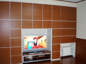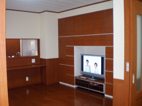 LDKに収納棚をそえつけました。テレビもおさまり、壁一面に収納できます。