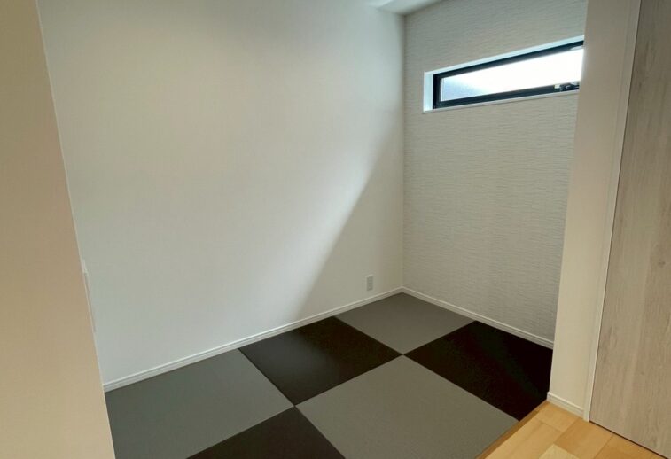 黒とグレーの畳やおしゃれなペンダント照明、ドアのミッキーマウスのくりぬきなど
